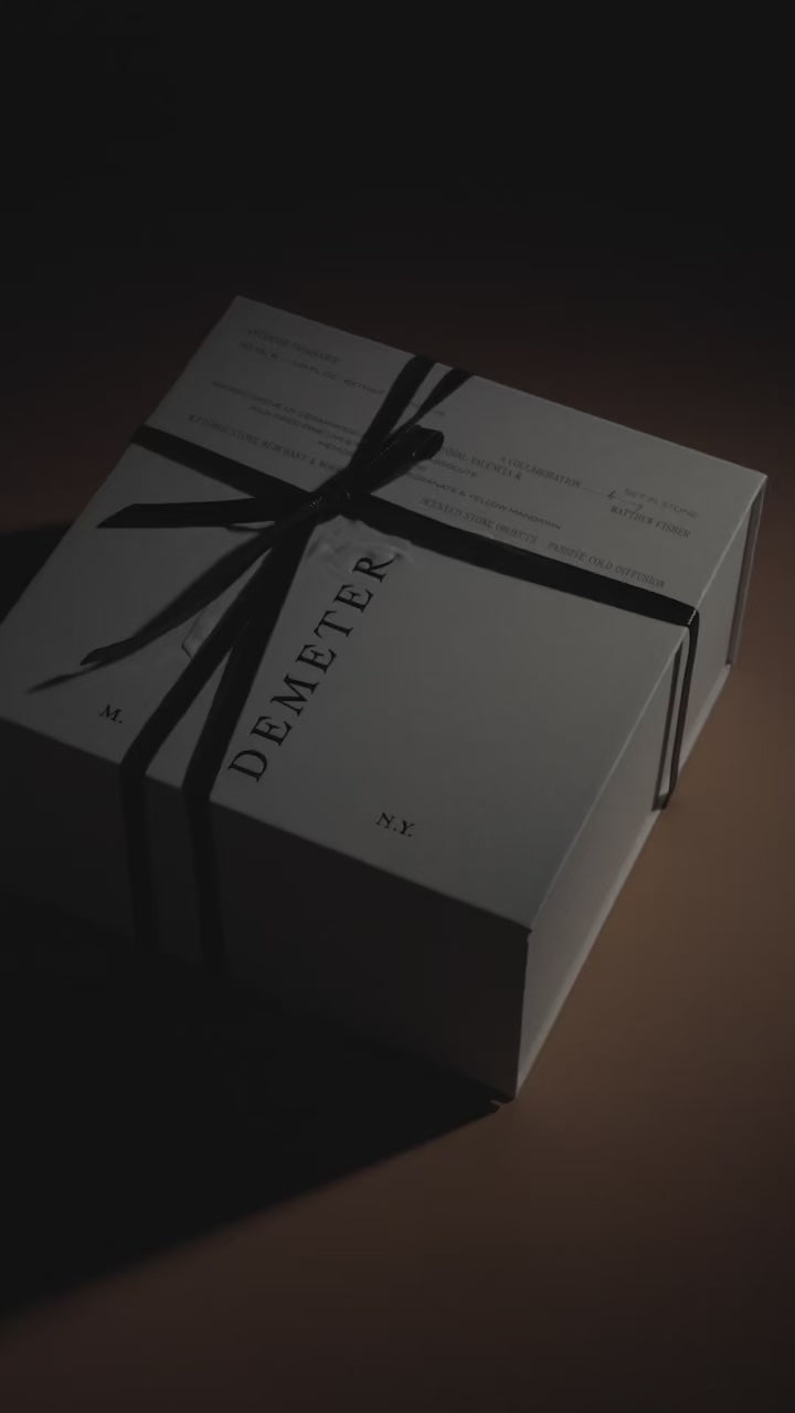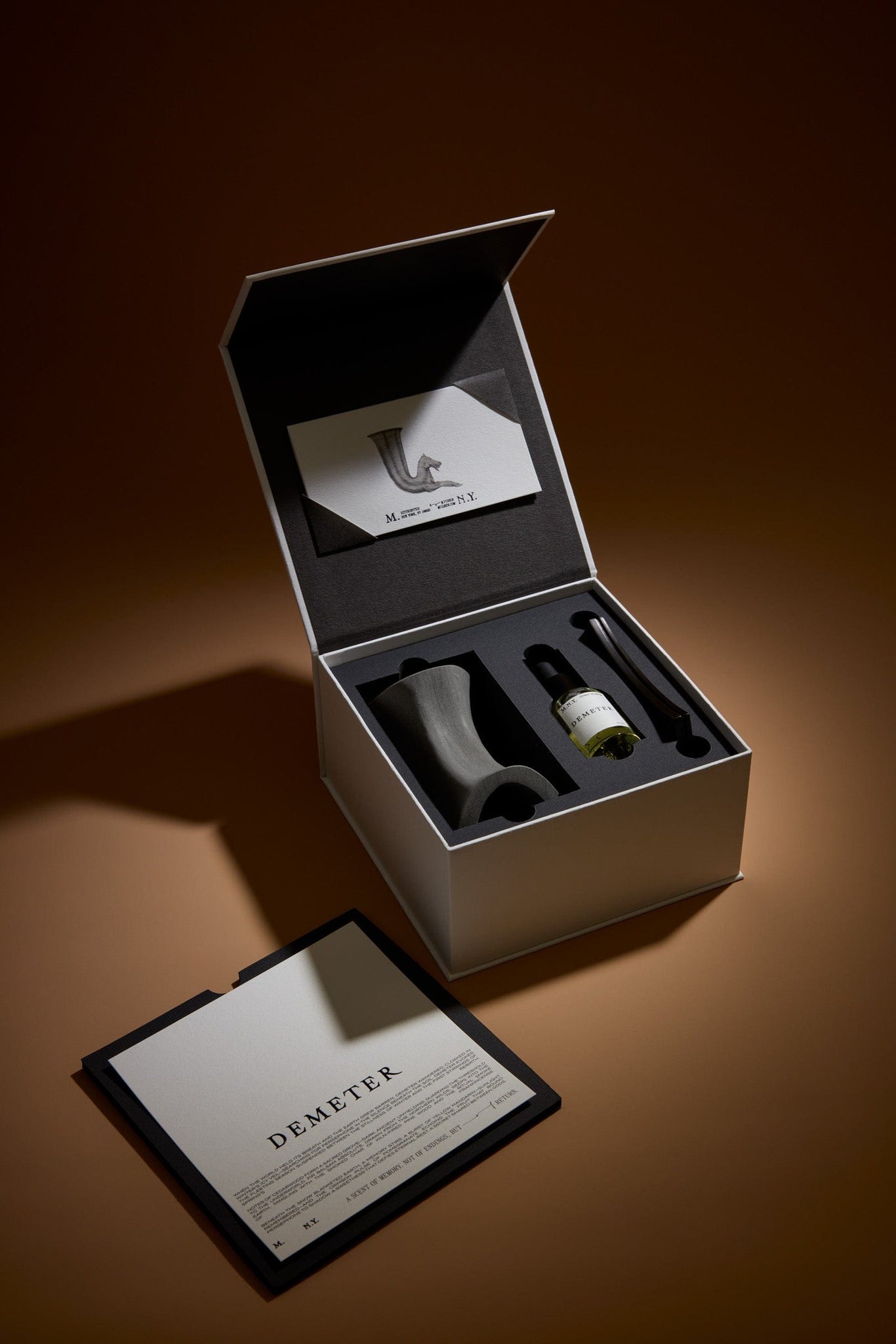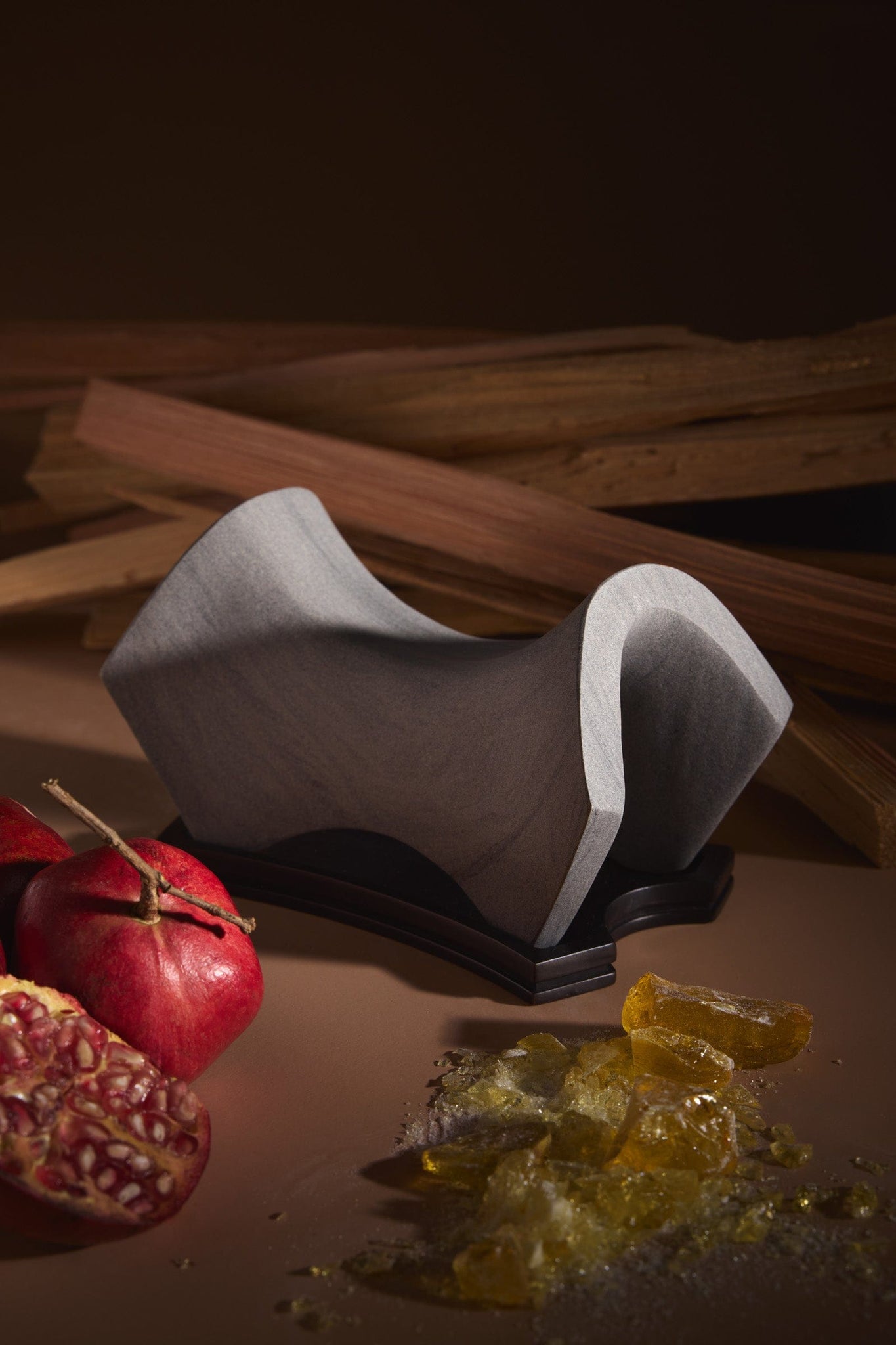 Each set includes a diffuser stone sculpture, a cast sculpture plate, and a 30ml extrait de parfum, presented in a branded box. The fragrance is designed for ritual use in the home: the oil is drawn across the carved scent stone to release fragrance into the air. The first production run is limited to 107 pieces.