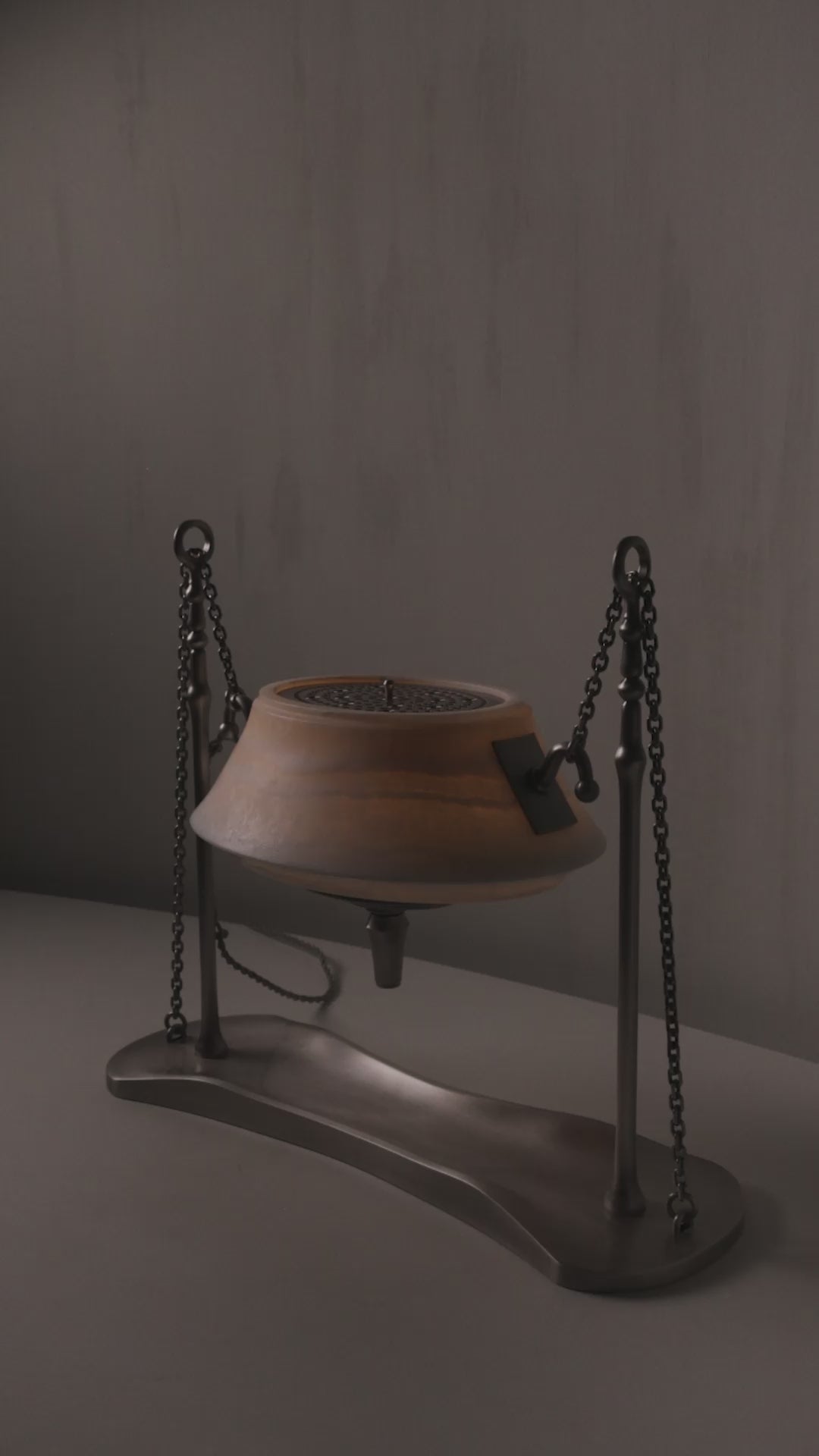 Poised in stillness, this lantern captures a moment of suspended grace - like Balanchine’s dancer, arched and balanced in light. Onyx bands glow from within, framed by a weightless metal armature. It is an object of tension and release, fragility and radiance, where form nearly dissolves into spirit.