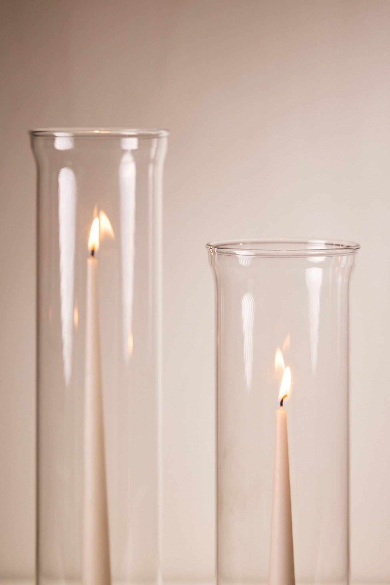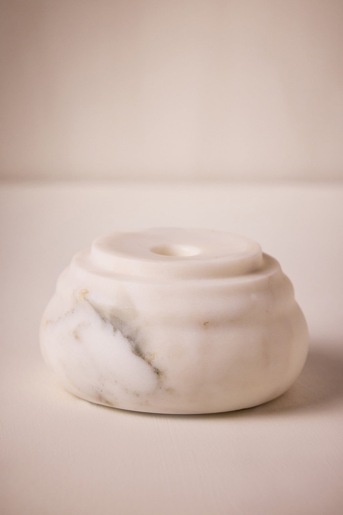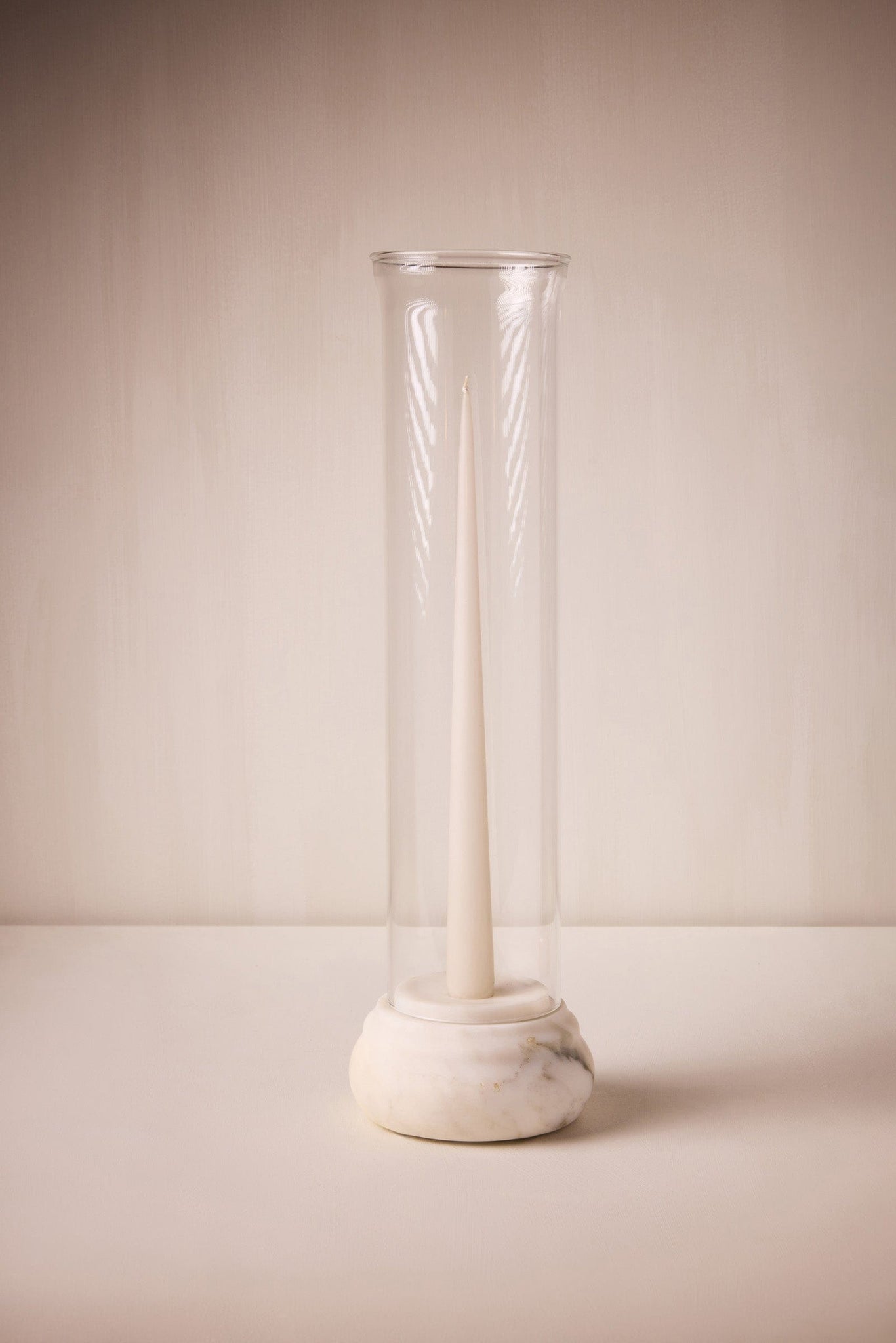 A hand-finished stone base grounds the piece with quiet permanence, while a borosilicate glass shade rises above in airy contrast. Together, they echo the ceremonial pyxis vessels of ancient Greece and Rome. Designed to cradle and elevate the f lame, the piece transforms light into ritual. The taller of a complementary pair, this piece is designed to accompany the shorter Object 19, Candle Holder Short.