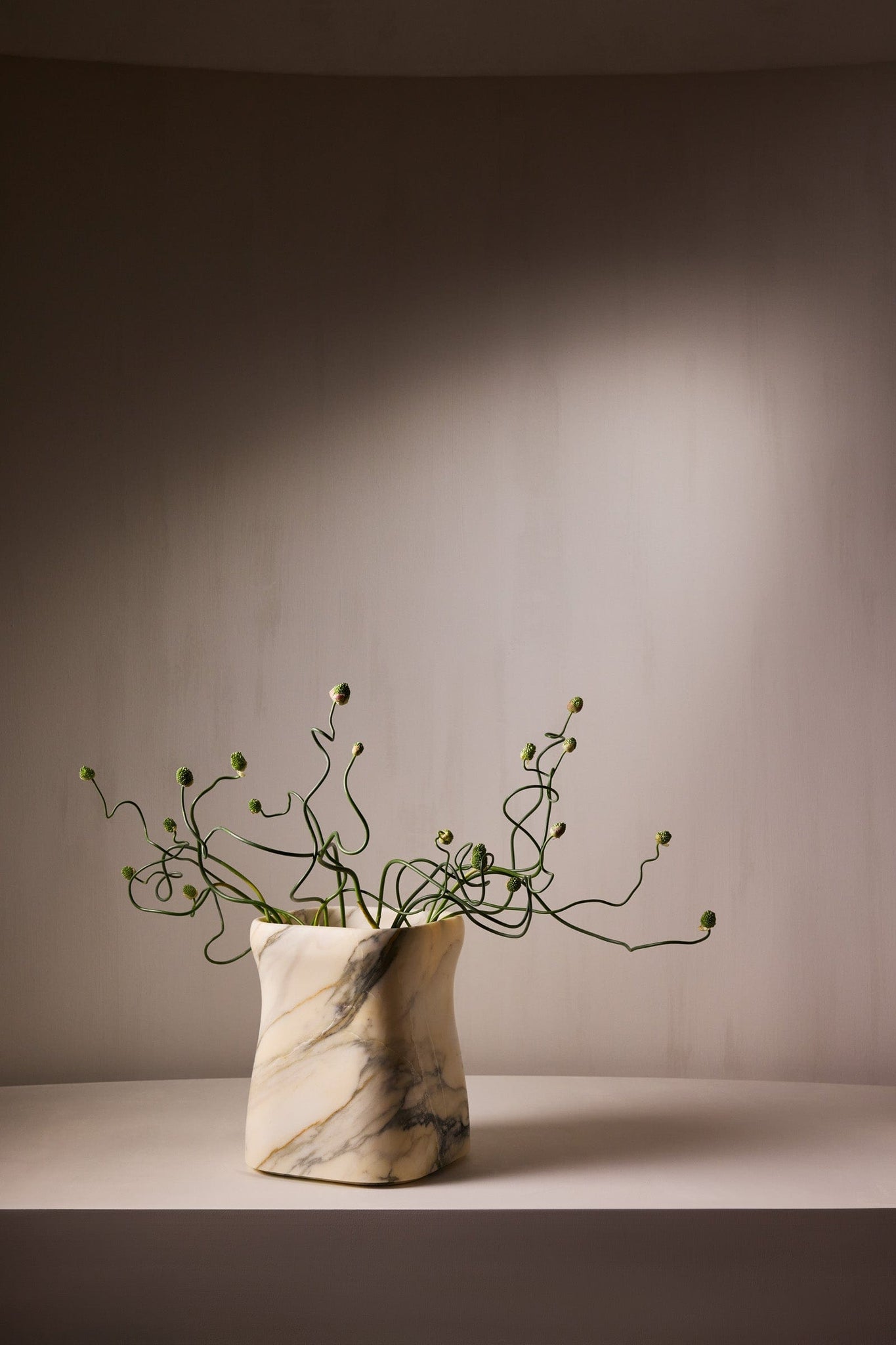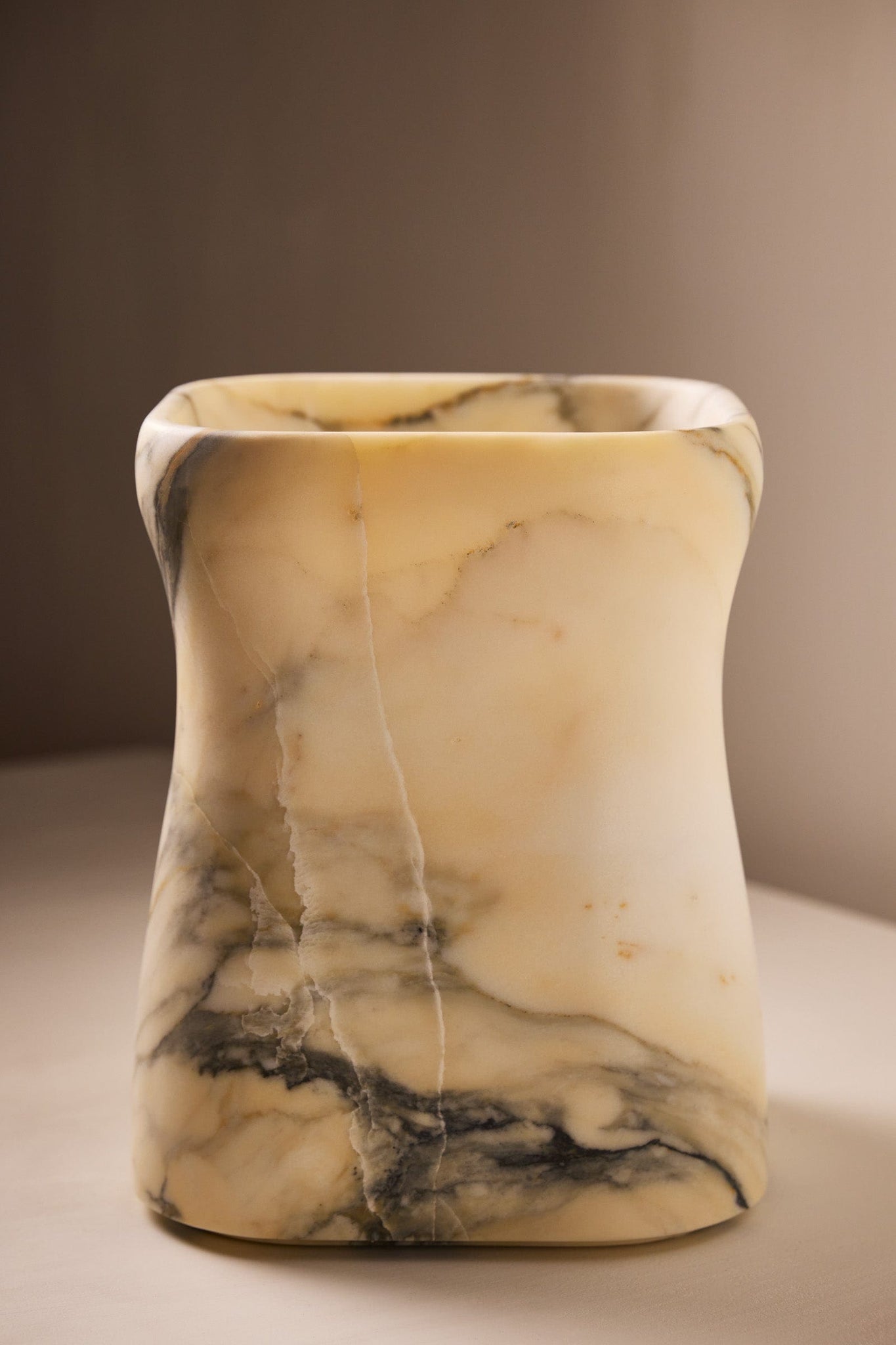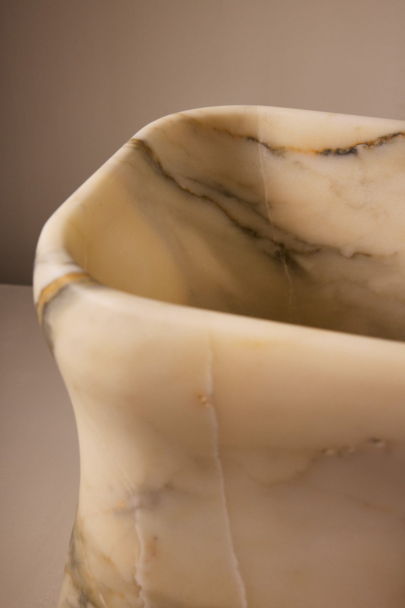 Inspired by the cleaved breaks of raw minerals, Vessel 18 features distinctly planar walls subtly softened by the suggestion of elemental wear. Its eroded form reflects geological processes and natural transformation. Designed to nest seamlessly into the square corner of Object 18, Platter, the vessel rests on a lofted platform, anchoring the forms in geometric harmony.