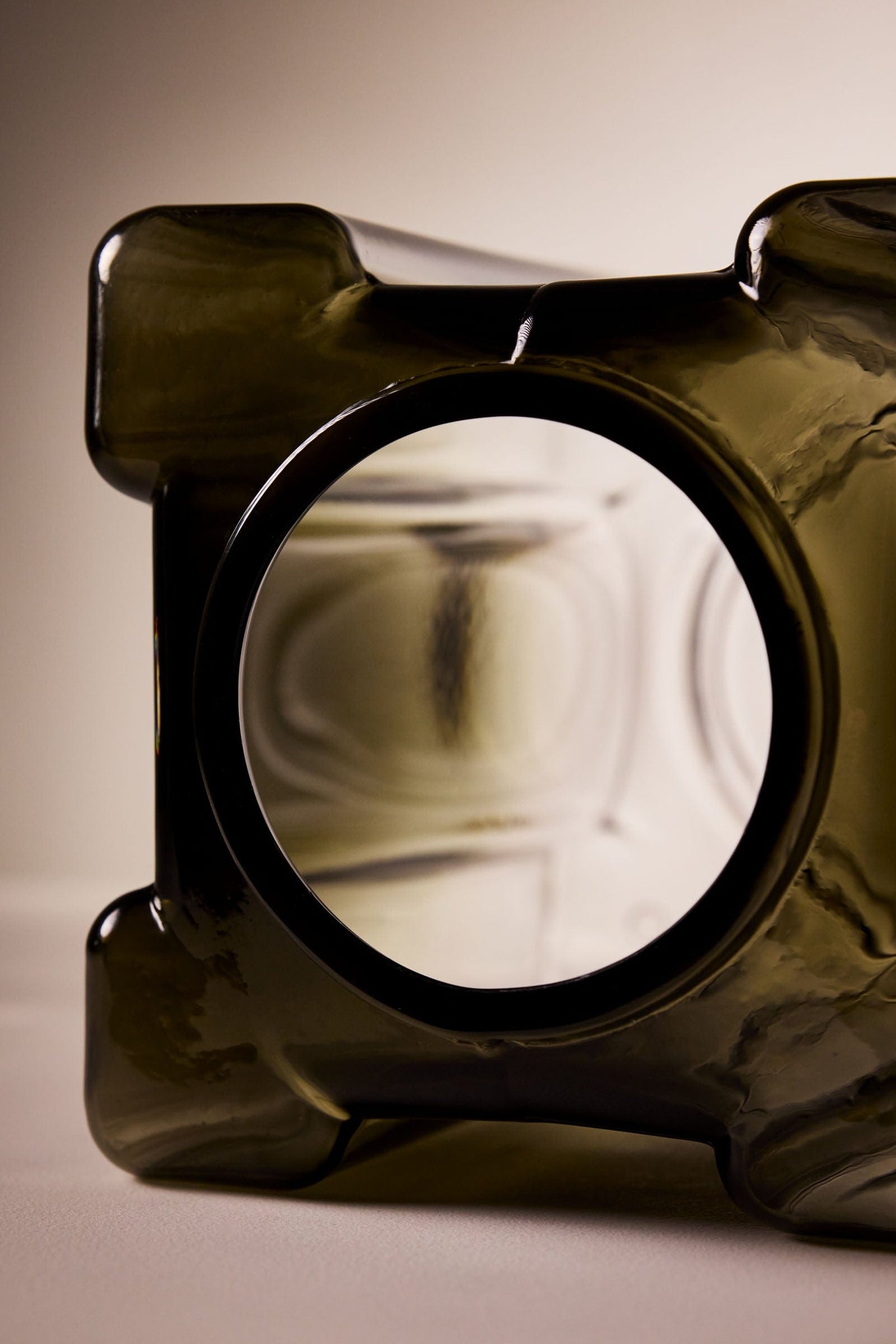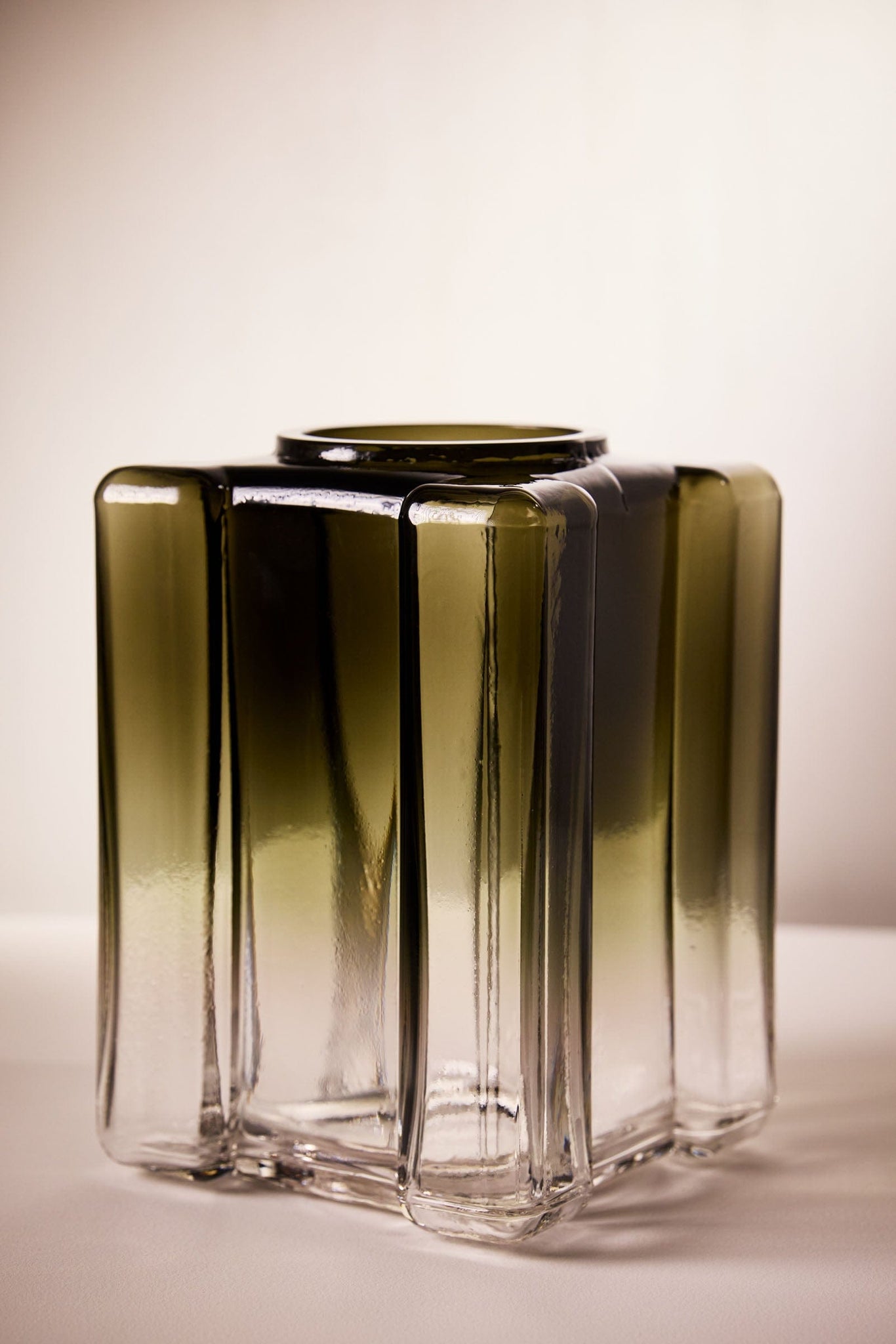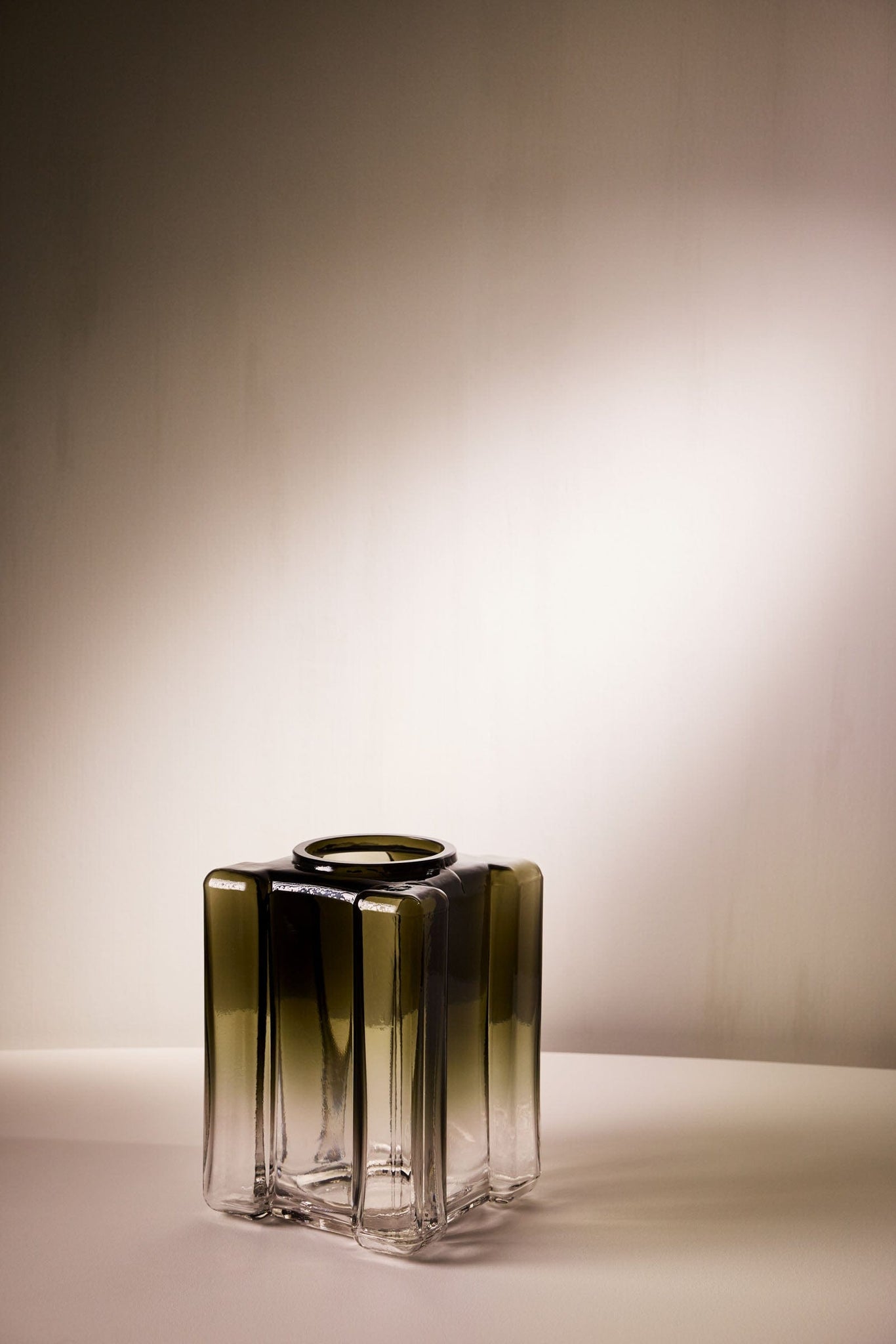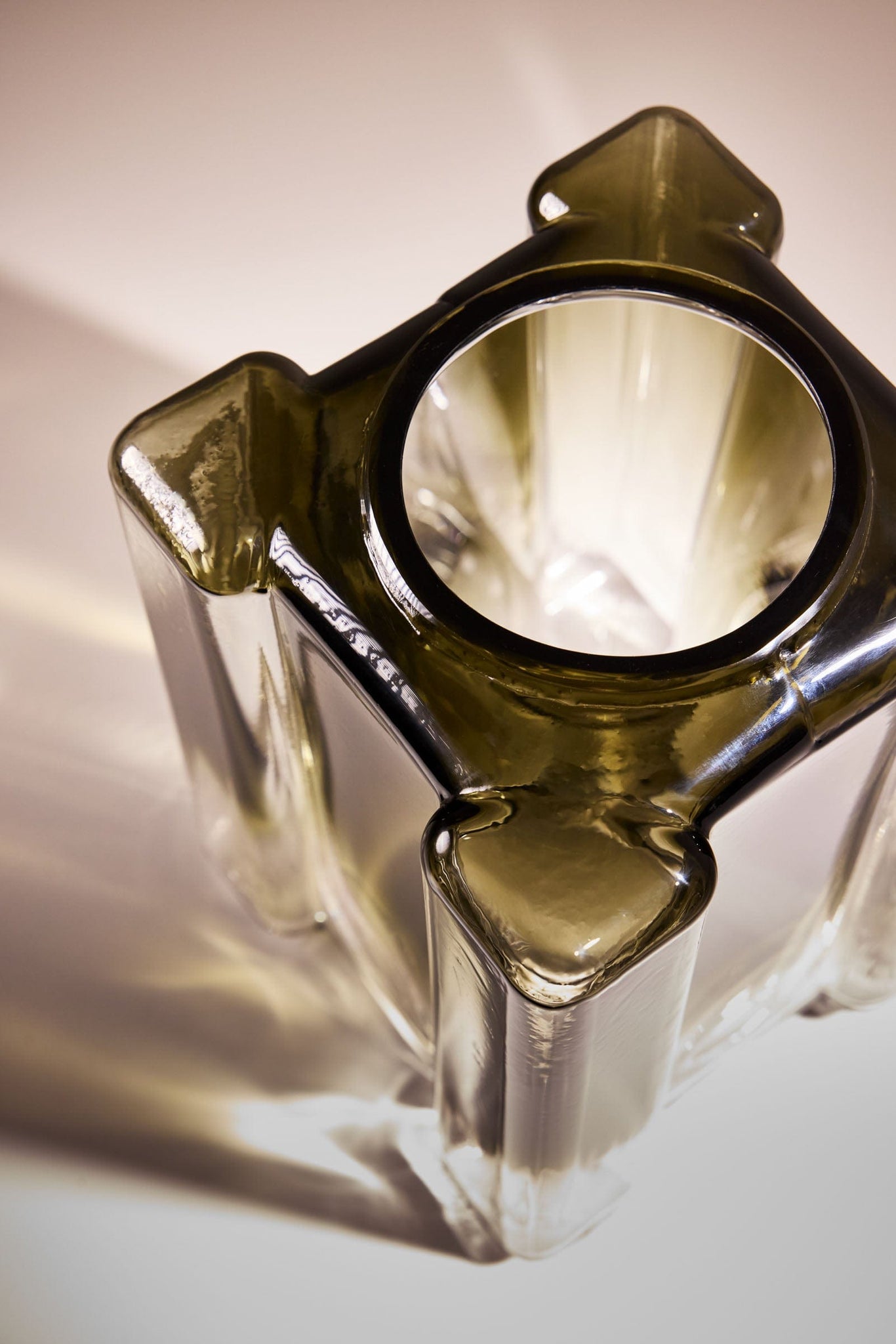 The planar walls of the vessel are marked with the organic movement of liquid glass due to a carefully controlled process of heating and cooling during fabrication. The resulting visual distortion and placement of colored gradient catches light within to create a mesmerizing effect. The work is an exploration of the visual fluidity observed in two-dimensional Gothic stained glass within a three-dimensional hand-blown glass object.