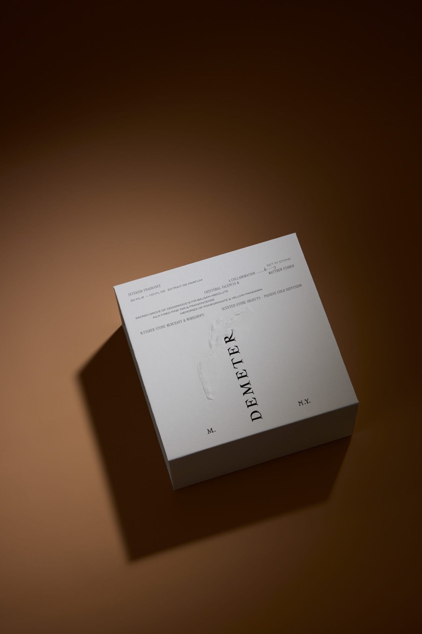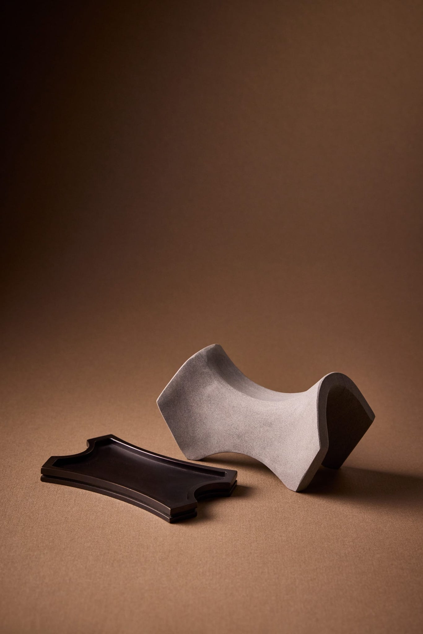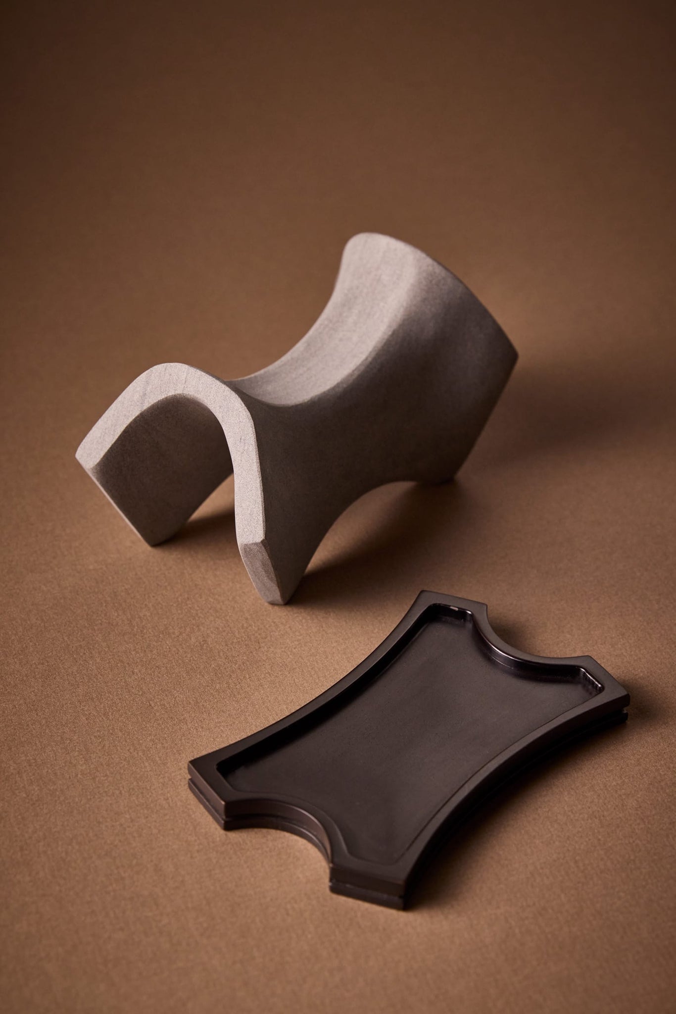 Each Presentation Set includes a hand-carved silver sandstone diffuser sculpture, a cast bronze plate, and a 30ml Extrait de Parfum, presented in a branded box. The oil is drawn across the carved stone arc of the sculpture, igniting the air and transforming the ordinary into ceremony. From a limited first production run of 107 pieces.